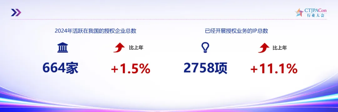 2024 年活跃在我国的授权企业总数为 664 家,同比增长 1.5%,已经开展授权业务的 IP 总数为 2758 项,同比增长 11.1%。
