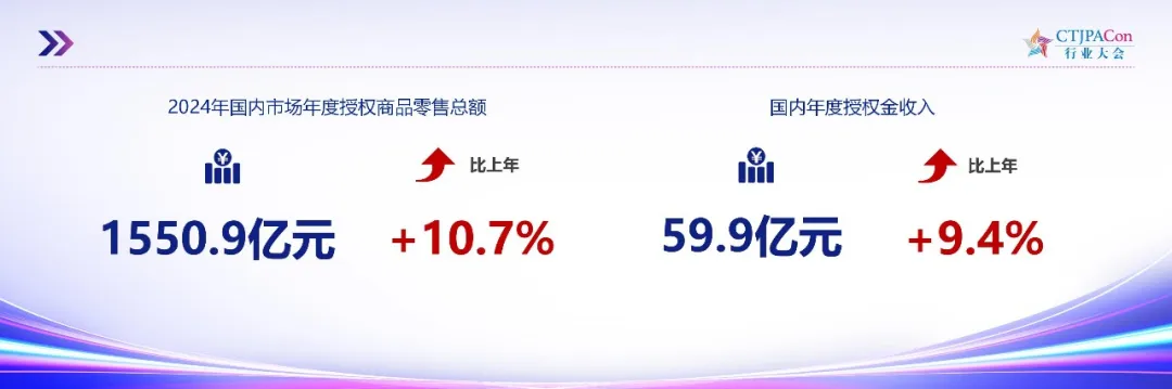 2024 年国内市场年度授权商品零售总额为 1550.9 亿元,同比增长 10.7%;2024 年中国年度授权金为 59.9 亿元,同比增长 9.4%。