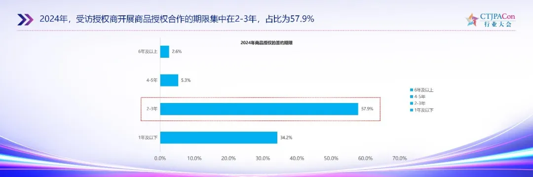 2024 年,受访授权商开展商品授权合作的期限集中在 2-3 年,占比为 57.9%。
