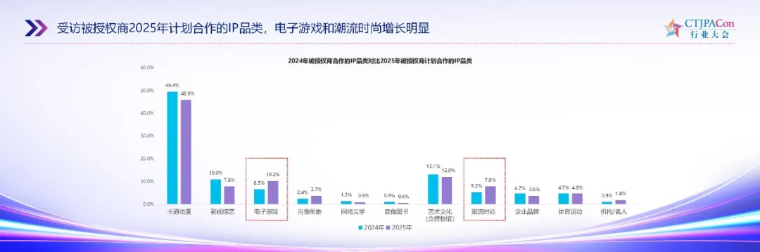 受访被授权商 2025 年计划合作的 IP 品类,电子游戏和潮流时尚增长明显。