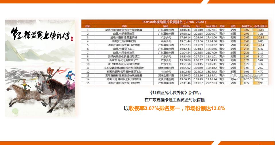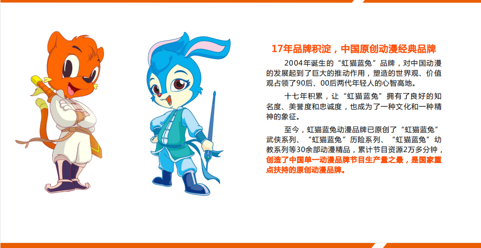 《虹猫蓝兔七侠传》动画共108集,每集15分钟左右,主要讲述了以虹猫蓝兔等为主的七位侠士与坏人魔教教主斗争的侠义故事。该剧从2006年9月5日起,在中央电视台少儿频道黄金时段播出;同年该剧获得中央电视台少儿节目及动画精品国产动画片一等奖。