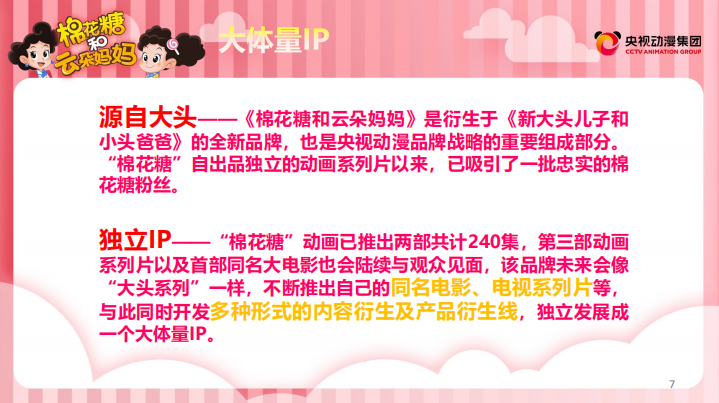 源自大头——《棉花糖和云朵妈妈》是衍生于《新大头儿子和小头爸爸》的全新品牌,也是央视动漫品牌战略的重要组成部分。“棉花糖”自出品独立的动画系列片以来,已吸引了一批忠实的棉花糖粉丝。